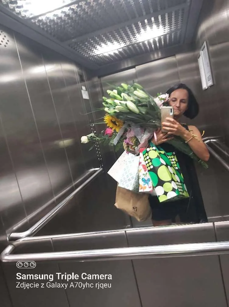 Na zdjęciu próbuje wnieść do domu część kwiatów i prezentów, które jak co roku dostała od dzieci i rodziców na zakończenie roku. Musiała potem jeszcze 4 razy jechać tą windą z kolejnymi prezentami. Jak sądzisz, czy wszyscy nauczyciele wracają z taką ilością prezentów z zakończenia roku szkolnego? O czym to świadczy, że Kasia zawsze jest tak obdarowywana?