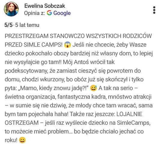 Ps. Zdjęcia z naszych wcześniejszych obozów pod treścią oferty! Na dole strony znajdziesz z kolei czerwony przycisk do kolejnej zakładki, z której dowiesz się szczegółów na temat cen i zapisów!